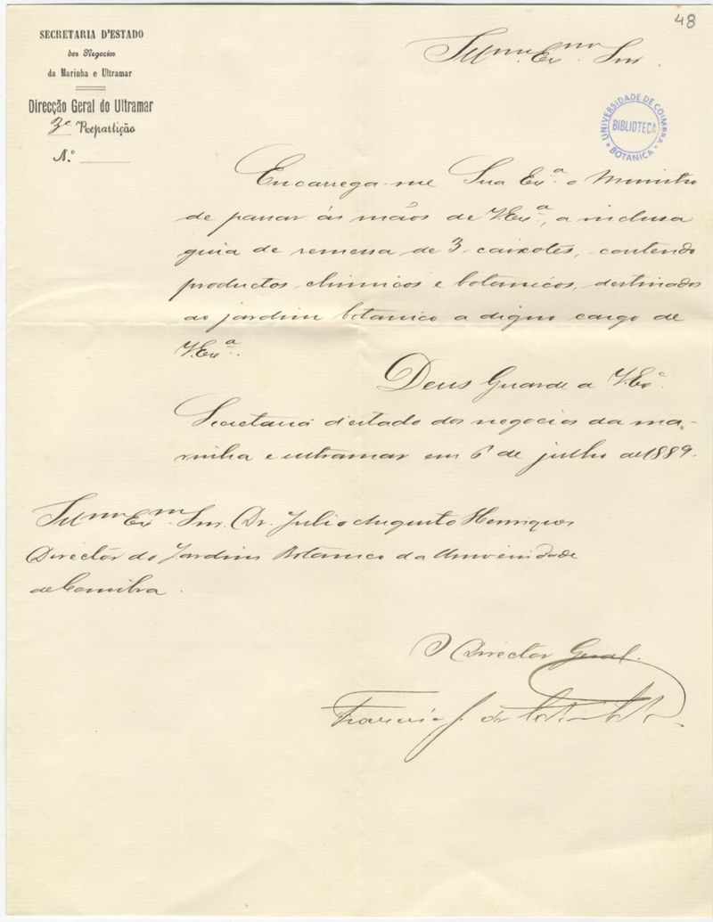 [Carta], 1889 Jul. 06, [Lisboa, a] Julio Augusto Henriques, Coimbra