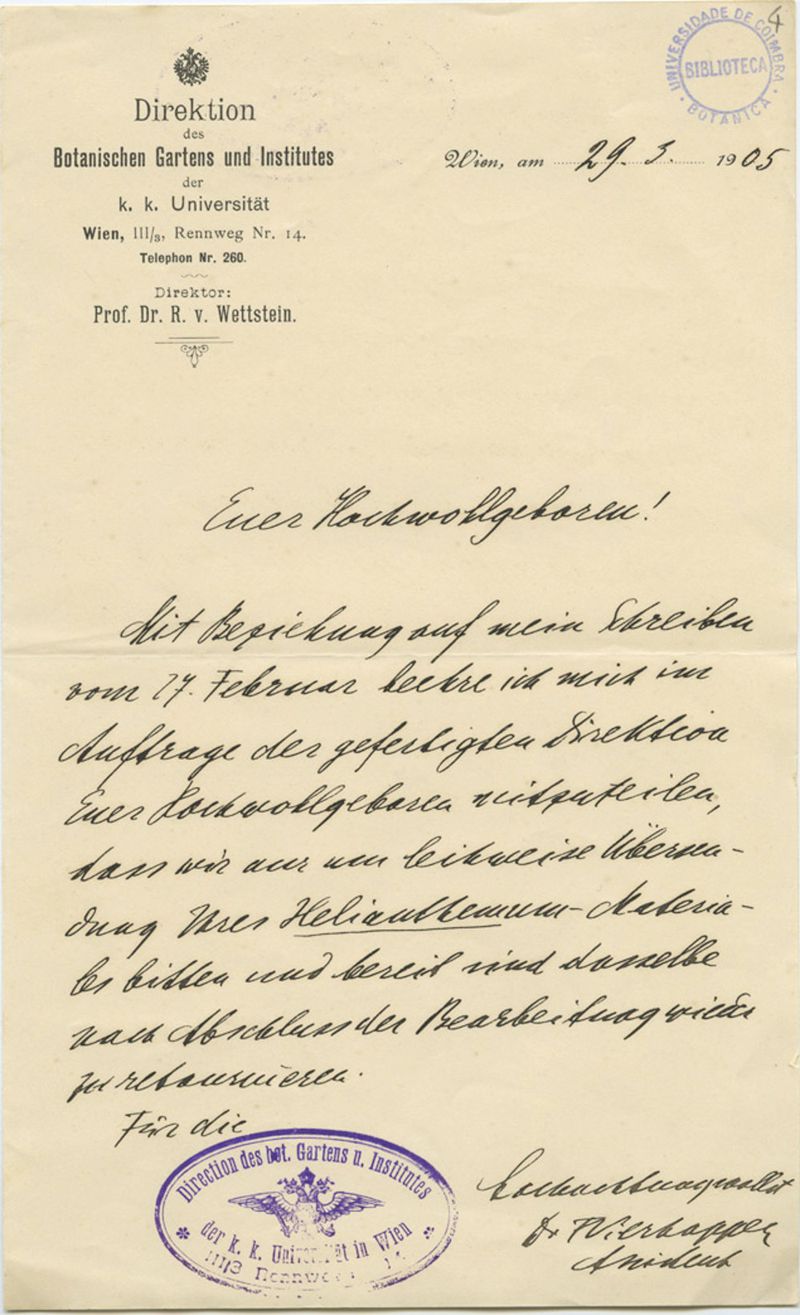 Papel timbrado de: Direction des Botanischen Gartens und Museums der k. k. Universität.