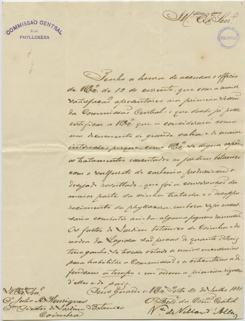 [Carta], 1881 Jul. 20, Porto, a Dr. Júlio A. Henriques, Coimbra