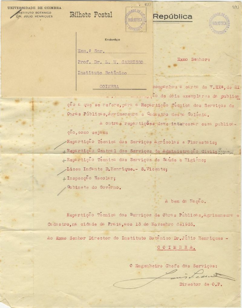 Acompanhado de cartão postal de "Universidade de Coimbra - Instituto Botanico de Julio Henriques"