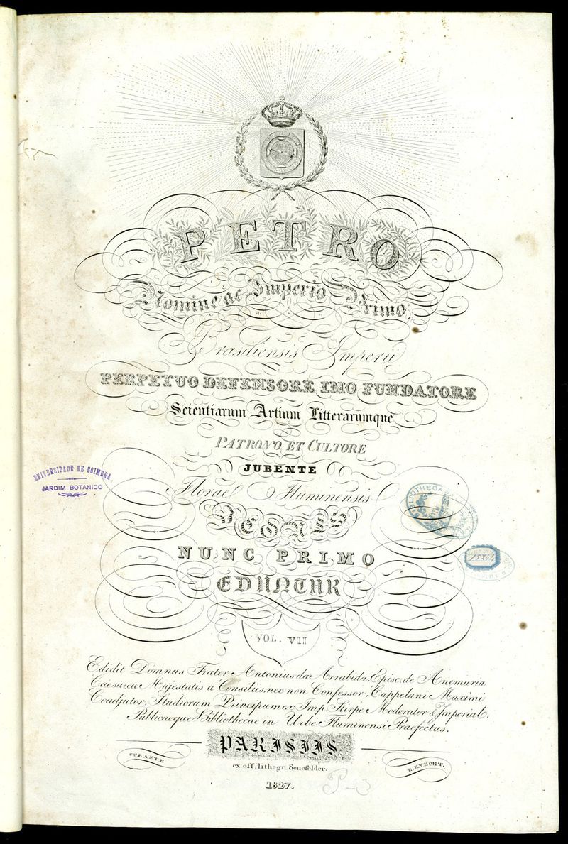 Petro Nomine ac Imperio primo brasiliensis imperii perpetuo defensore imo fundatore scientiarum artium litterarumque patrono et cultore jubente Florae fluminensis icones nunc primo eduntur