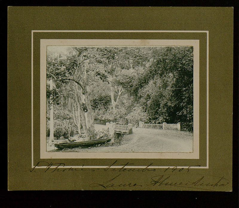 Nota ms. sobre a orla: "S. Thomé - Setembro 1905 - Laura Almeidinha". - Nota ms.no verso: "Ponte sobre o Rio do Ouro dentro da roça do mesmo nome".