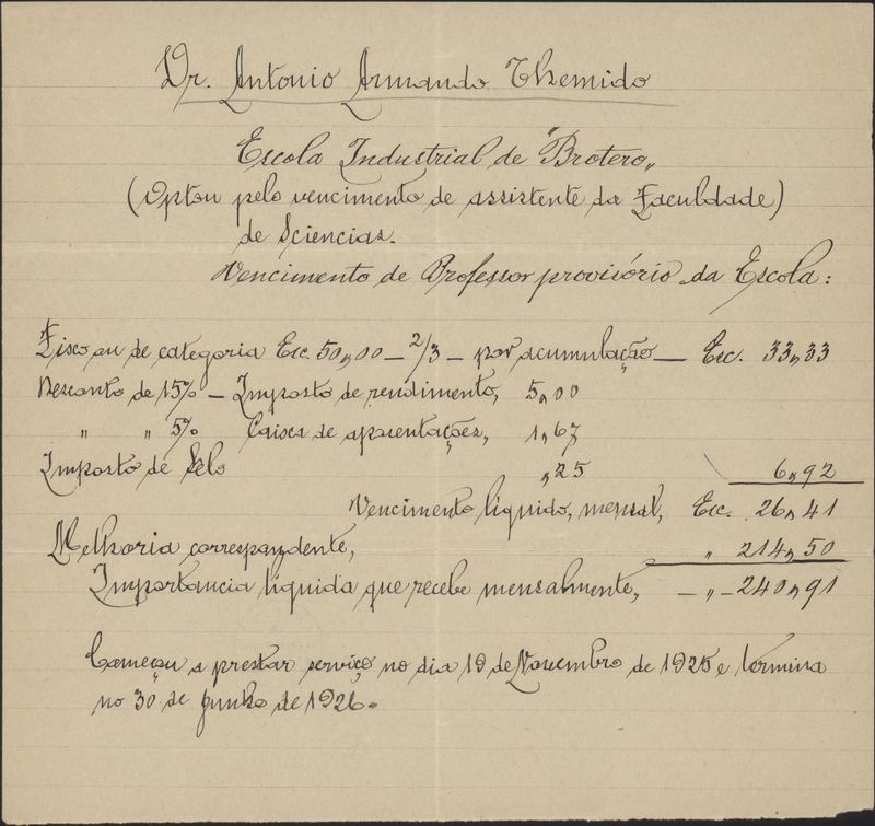 O processo de professor contém documentos referentes à actividade docente exercida por António Armando Temido na Faculdade de Ciências da Universidade de Coimbra.