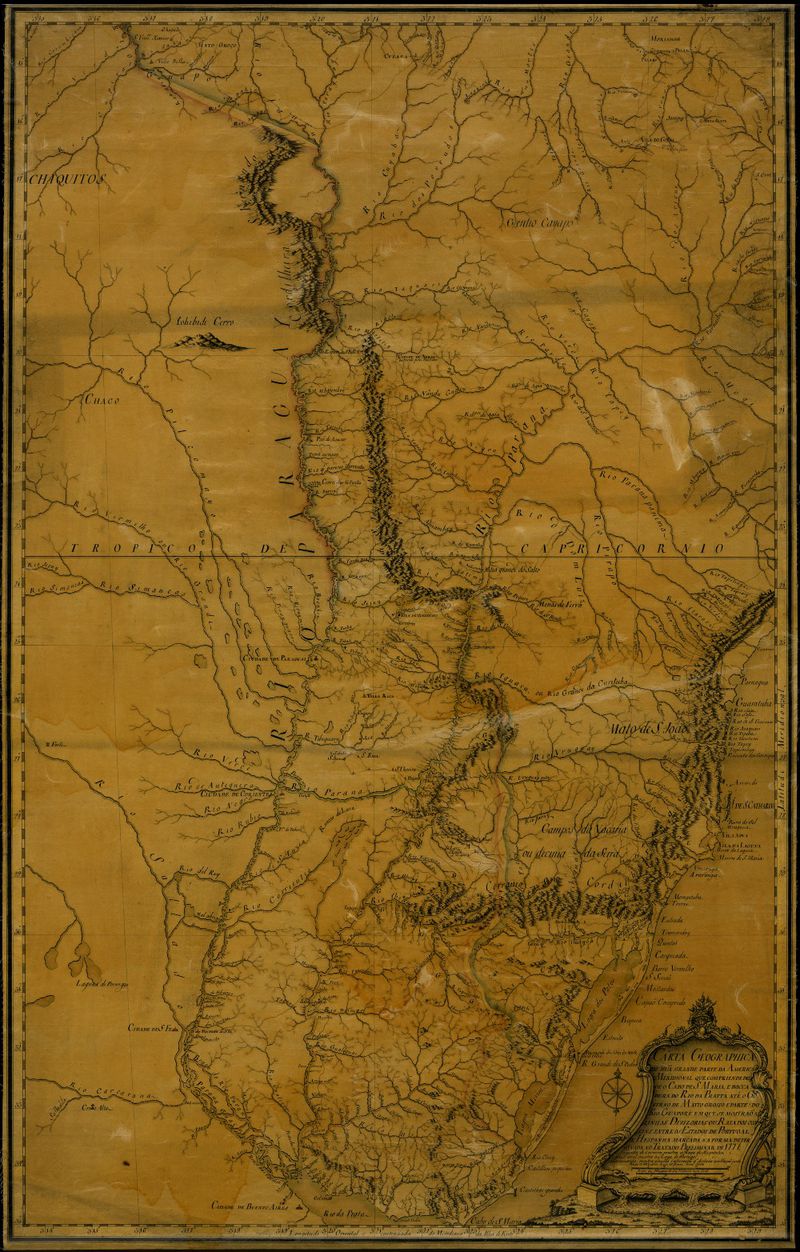 Carta geográfica de uma grande parte da América Meridional que compreende desde o Cabo de S. Maria, e embocadura do rio de Prata até ao governo de Mato Grosso e parte do rio Guaporé em que se mostram as linhas divisórias ou raia dos confins entre os Estados de Portugal e Espanha marcada na forma determinada do Tratado Preliminar de 1777