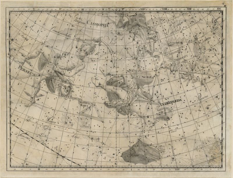 Contém estrelas de diversas constelações: Cassiopeja, Andromed, Triangulum majus et minus, Perseus, Honores Friderica e Laceria, identificadas em: BODE, Johann Elert - Uranographia sive astrorum descriptio. Berolini, 1801.