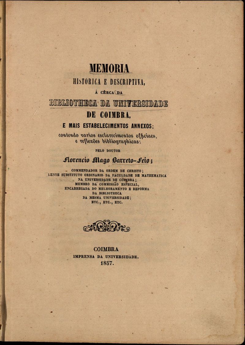 Memoria historica e descriptiva á cêrca da Bibliotheca da Universidade de Coimbra, e mais estabelecimentos anexos : contendo varios esclarecimentos officiais, e reflexões bibliográficas