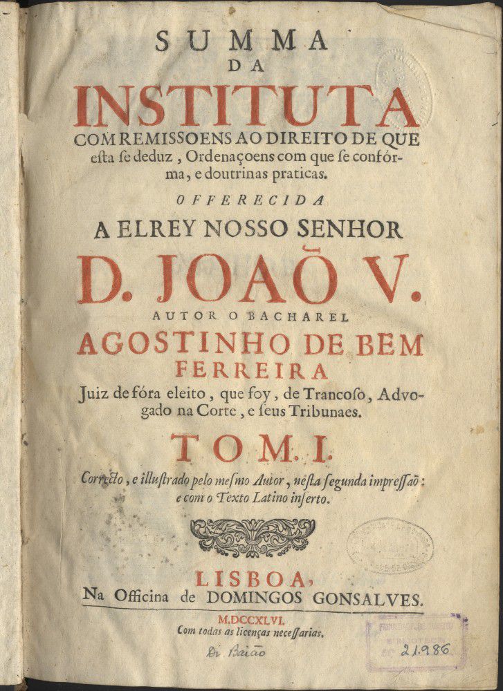 Summa da Instituta com remissoens ao direito de que esta se deduz, ordenaçoens com que se confórma, e doutrinas praticas ... / autor ... Agostinho de Bem Ferreira ...