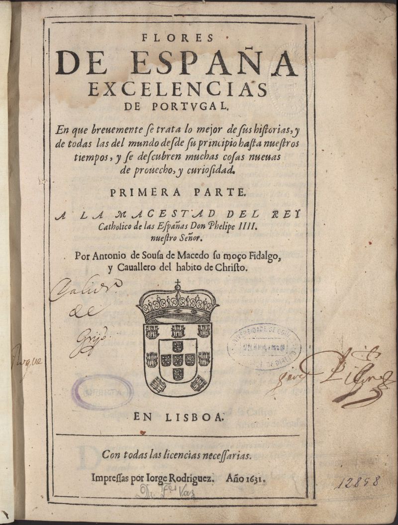 Flores de España excelencias de Portugal : en que brevemente se trata lo mejor de sus historias, y de todas las del mundo desde su principio hasta nuestros tiempos, y se descubren muchas cosas de provecho, y curiosidad : primera parte ...