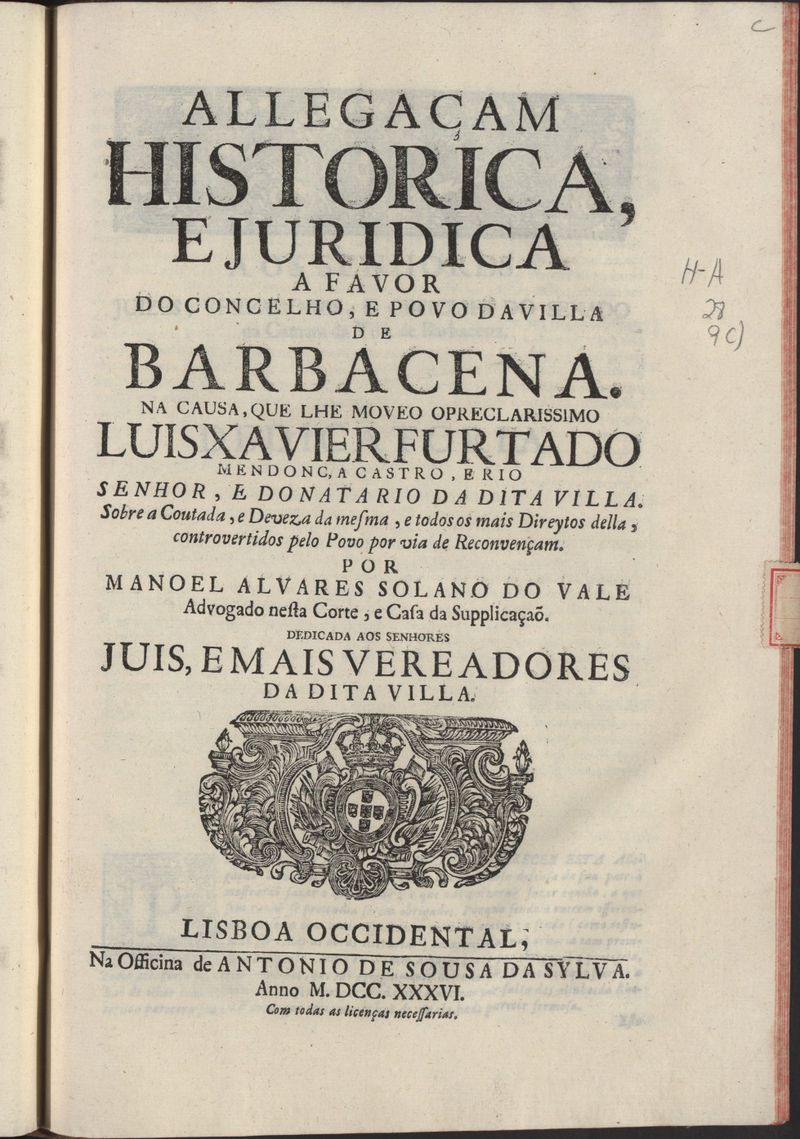 Allegaçam historica, e juridica a favor do concelho, e povo da villa de Barbacena na causa, que lhe moveo o preclarissimo Luis Xavier Furtado Mendonça Castro, e Rio, senhor e donatario da dita villa sobre a coutada, e deveza da mesma, e todos os mais direitos della, controvertidos pelo povo por via de reconvençam