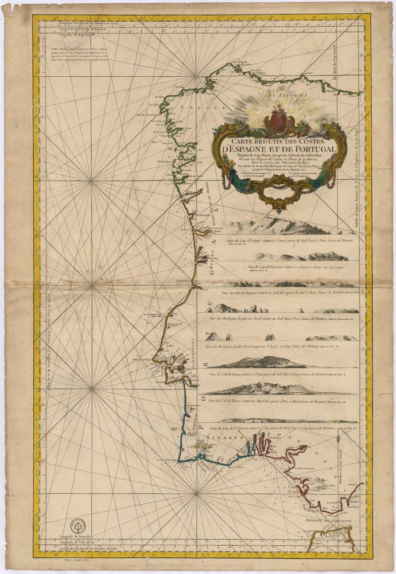 No canto sup. esquerdo apresenta a seguinte nota: "Plusiuers cartes marquent une Roche ou Vigie à quelques lieuës du Cap St. Vincent , mais différament. Les unes à 5 ou 6 lieuës au S.S.O. Nous l'avons supprimée, aiantlieu de croire quélle néxiste pas."