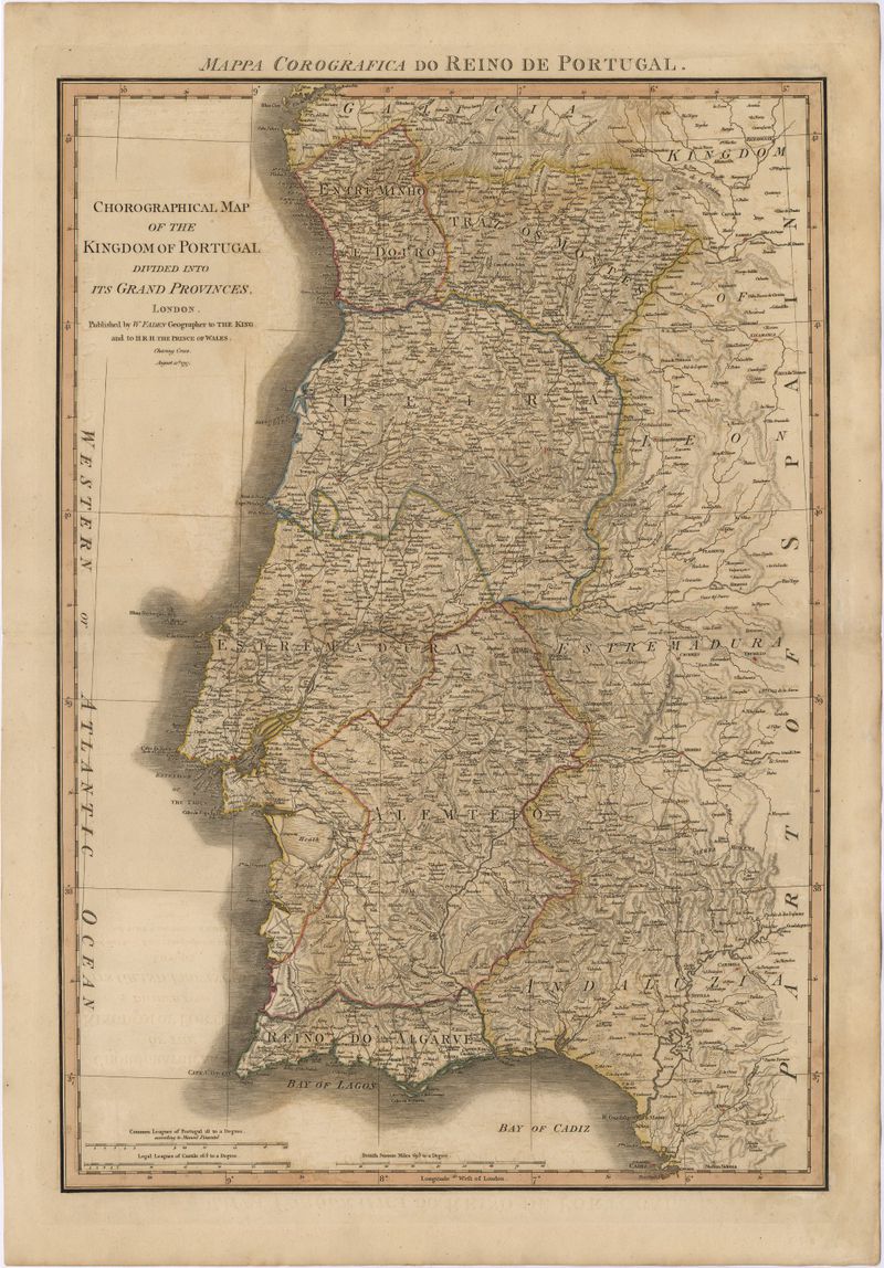 Escalas gráficas de: 20 Common Leagues of Portugal 18 to a Degree; 30 Legal Leagues of Castile 26 1/2 to a Degree" e "80 British Statute Miles 69 1/2 to a Degree"