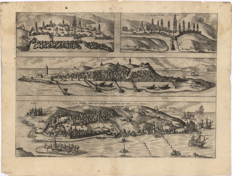 [Anfa, qvibvsdam Anaffa; Azaamvrvm; Div, Goa fortissima Indiae urbs in Christianorum potestatem anno salutis 1509 devenit]