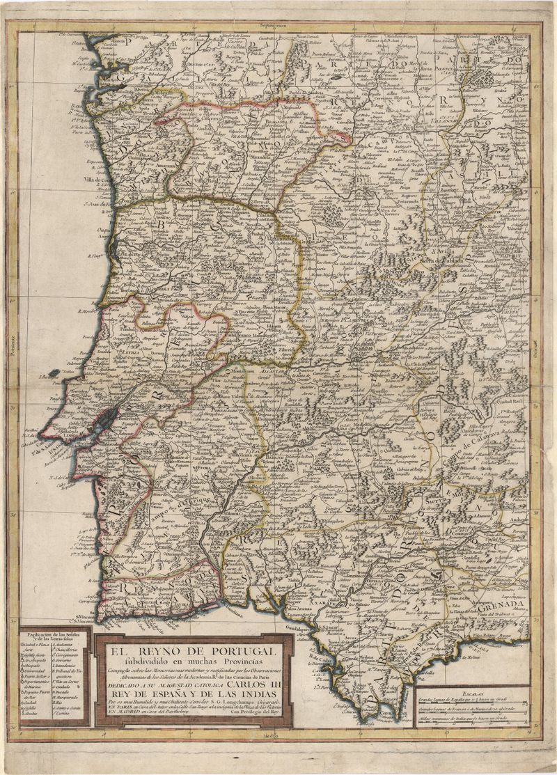 El Reyno de Portugal subdividido en muchas Provincias : compuesto sobre las memorias mas modernas y rectificadas por los observaciones astronomicas de los señores de la Academia Rl. de las Ciencias de Paris : dedicada a su magestad Catolica Carlos III Rey de España y de las Indias
