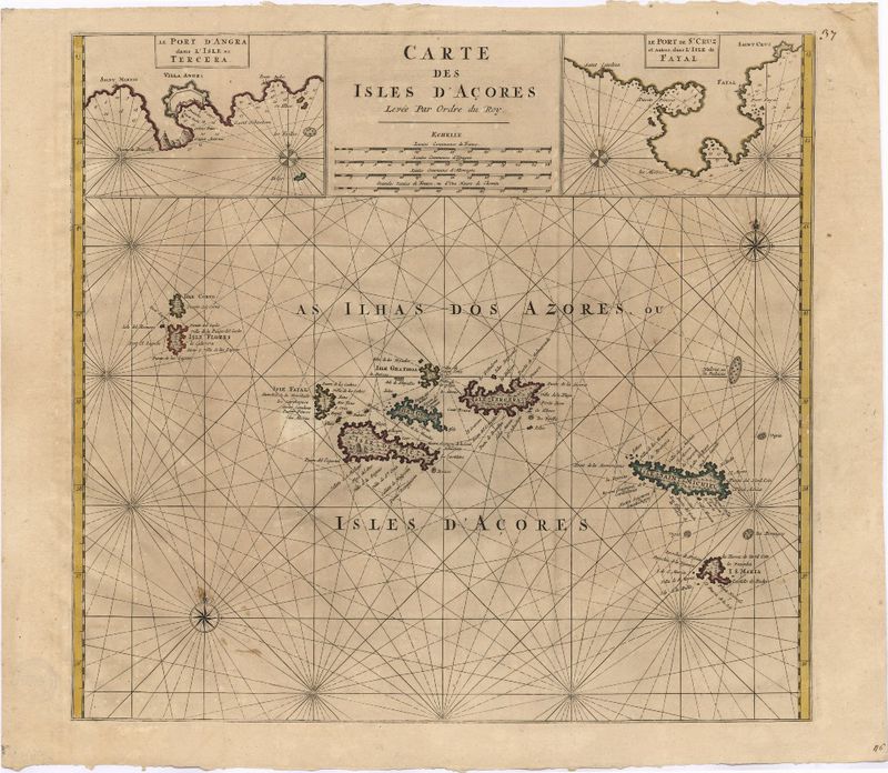 Inclui os seguintes mapas insertos: no canto superior esquerdo: "Le Port d'Angra dans l'Isle de Tercera". - Escala não determinada. - 12x18,5 cm ; canto superior direito: "Le Port de S.t Cruz et autres dans l'Isle de Fayal". - Escala não determinada. - 12x18,5 cm