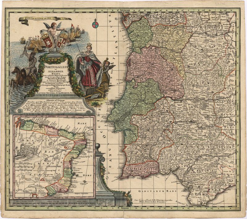 Portugalliae et Algarbiae Regna cum Confinibus Hispaniae Provinc. simul vero peculiari Mappa Brasiliae Regnum in America Meridionali, cujos ora maritima Regem Portugalliae Dominum veneratur et Promogenito Regio Infanti prope dicata floret, recentissima delineatione publici juris facta