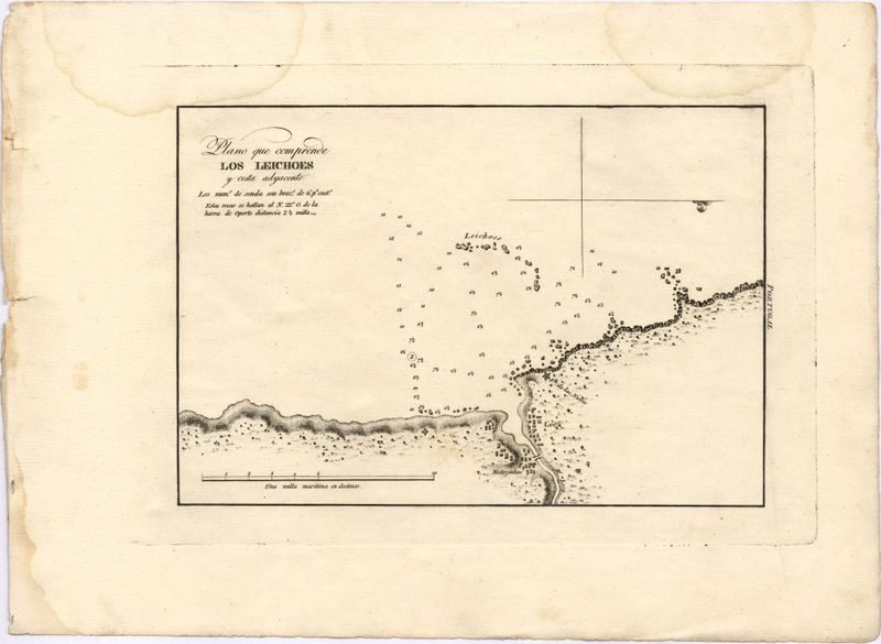 Plano que comprende los Leichoes y costa adyacente [Material cartográfico] : Los nums. de sonda son brazs. de 6 ps. casts. Estas rocas se hallan al N. 22°O de la barra de Oporto distancia 2 3/4 millas
