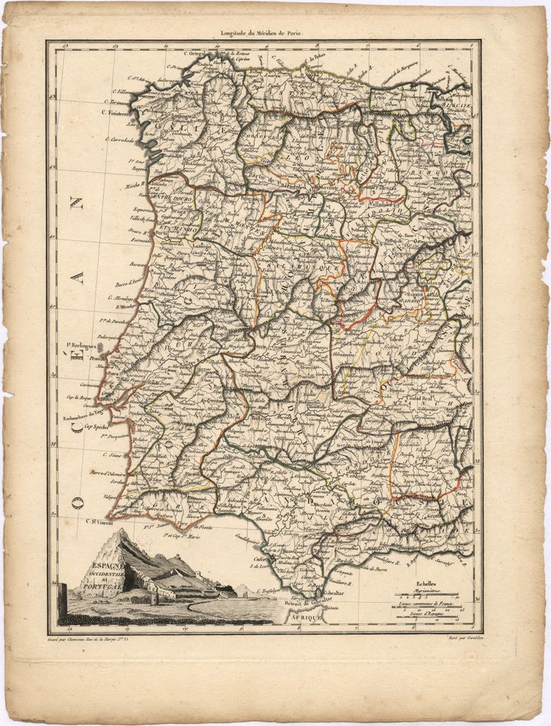 Escala gráfica: 10 myriamètres ; 25 lieues communes de France; 15 lieues d'Espagne.