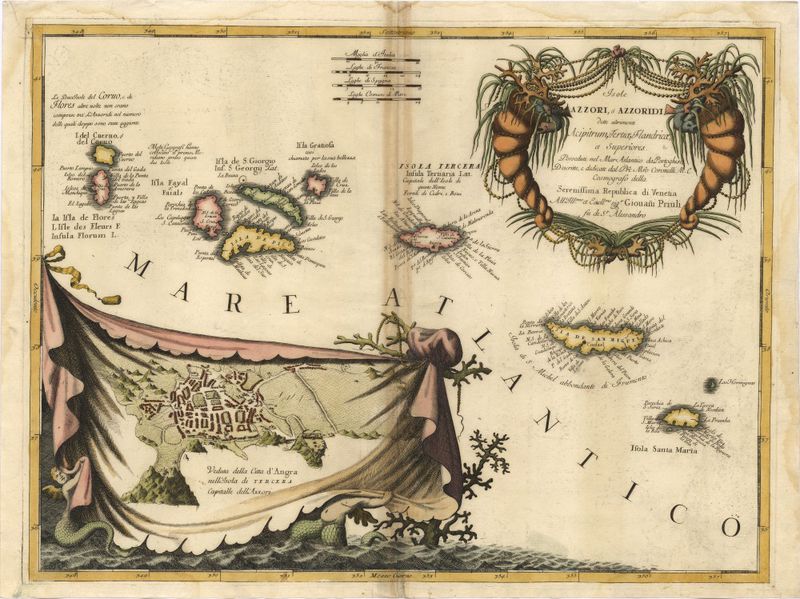 Na margem inferior esquerda: "Veduta della Citta d'Angra nell'Isola di Tercera Capitalle dell'Azzori", planta de Angra do Heroísmo, desenhada sobre panejamento de fundo, sustentado por corais e figuras antropomórficas marinhas e aladas.