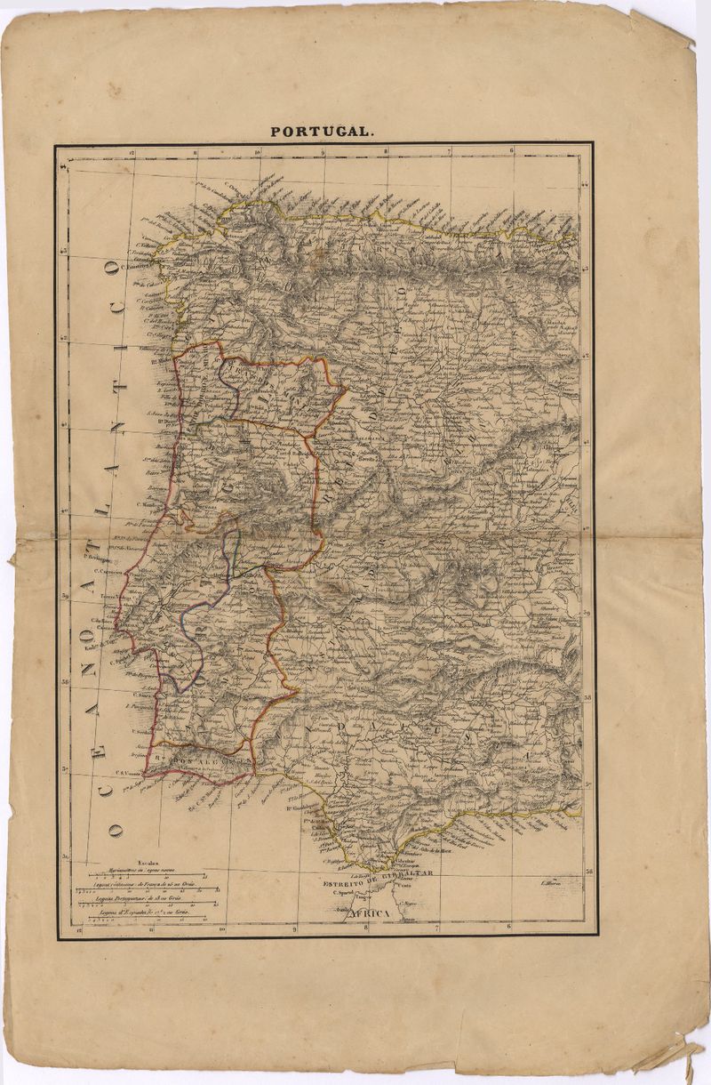 Escala gráfica: 15 Myriametres ou legoas novas ; 35 legoas communs de France de 25 ao Gráo ; 25 Legoas Portuguezas de 18 ao Gráo ; 20 Legoas d'Espanha de 17 1/2 ao Gráo.