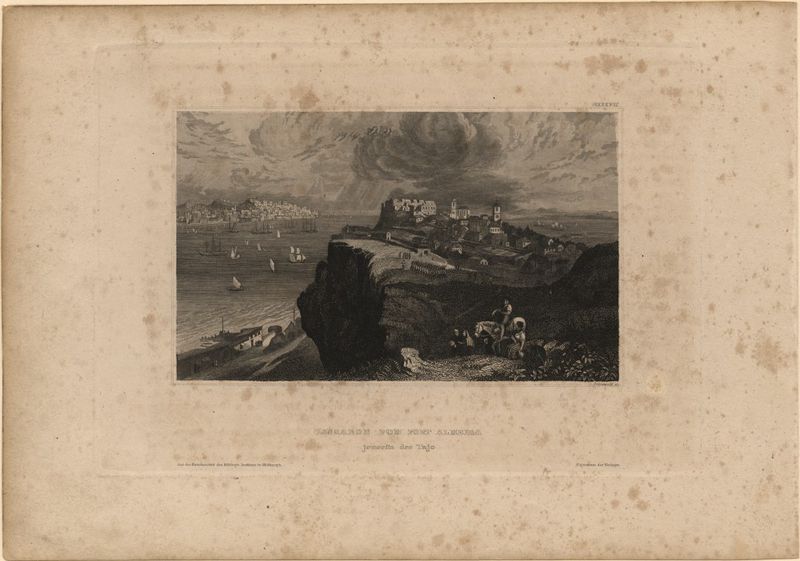 Vista de Lisboa da margem oposta, no Tejo alguns navios e pequenos barcos à vela, em 1{u00BA} plano um homem a cavalo rodeado por 3 mulheres, um batalhão de soldados em exercícios e uma fortaleza.