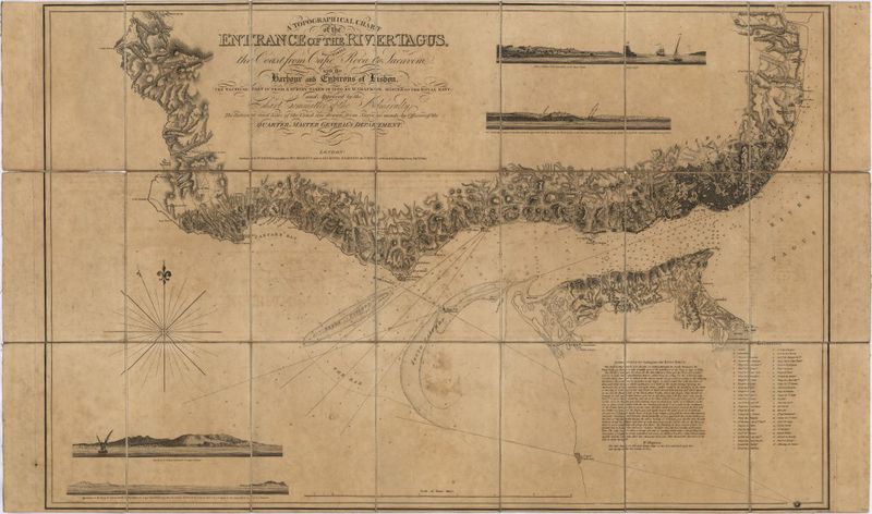 A topographical chart of the entrance of the river Tagus, describing the coast from Cape Roca to Sacavem ; with the harbour and environs of Lisbon. The nautical part is from a survey taken in 1806 by W. Chapman, Master of the Royal Navy; and approved by the Chart Committee of the Admiralty. The interior and line of the coast are drawn from survays made by officers of the Quarter Master General's Department