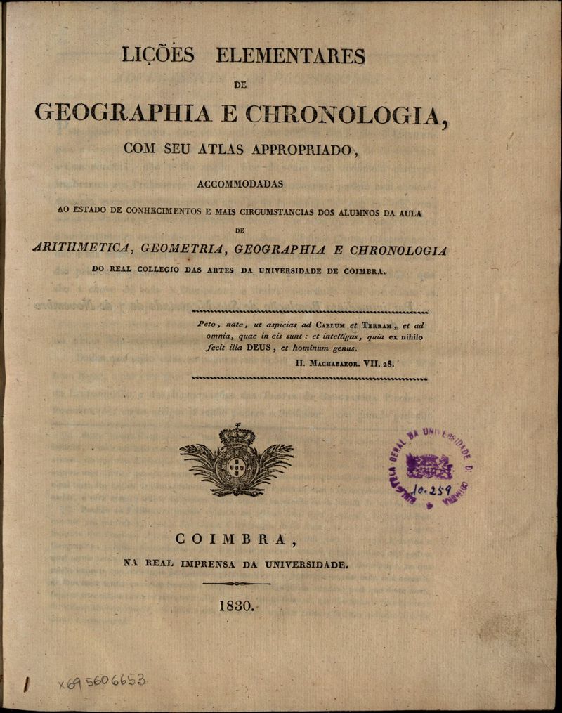 Lições elementares de geographia e chronologia, com seu atlas appropriado, accommodadas ao estado de conhecimentos e mais circumstancias dos alumnos da aula de arithmetica, geometria, geographia e chronologia do Real Collegio das Artes da Universidade de Coimbra