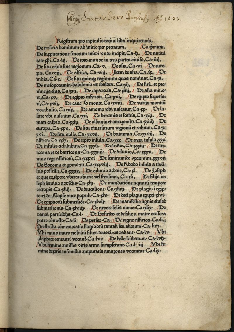 Manchas de acidez, humidade, manuseamento e picos de insectos. - Notas mss. - Pert.: "Colegii Societatis Jesu Burg... Agº 1633". - Enc. em pele com fechos de metal, brochos e corrente de metal.