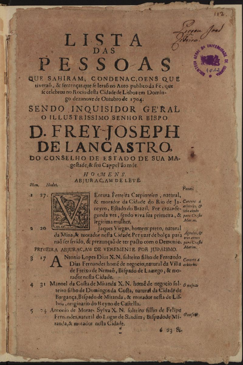 Lista das pessoas que sairam, condenações que tiveram e sentenças que se leram, no Auto público da Fé, que se celebrou no Rossio desta cidade de Lisboa, no domingo 19 de Outubro de 1704..