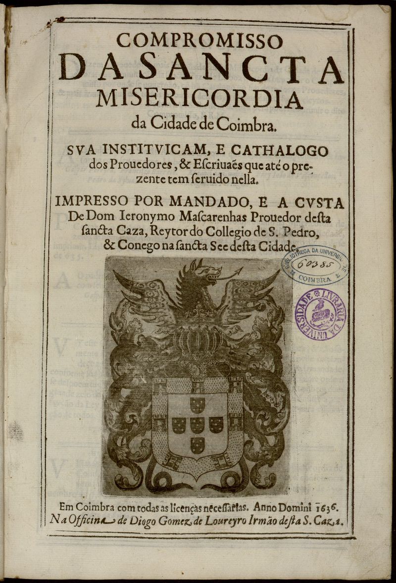 Compromisso da Sancta Misericordia da Cidade de Coimbra sua Instituiçam e Cathalogo dos Prouedores & Escriuães que até ao prezente tem seruido nella