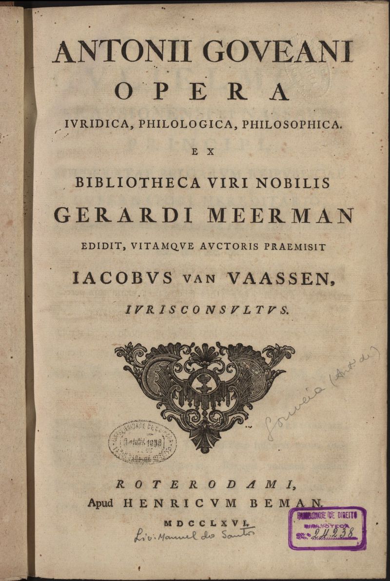 Contém: [Dedicatória] a Gulielmo V Arausionensi et Nassavio Principi ... / Gerardus Meerman. - p. [3]-[8]. - [Prefácio] / Jacobus van Vaassen. - p. [9]-[12]. - Jacobi Van Vaassen Jurisconsulti Dissertatio de Vita et scriptis Antonii Goveani aetatis suae jurisconsultorum principis ad illustrissimum comitem, Ludovicum Ncolaum de Gouvean. - LIX p.
