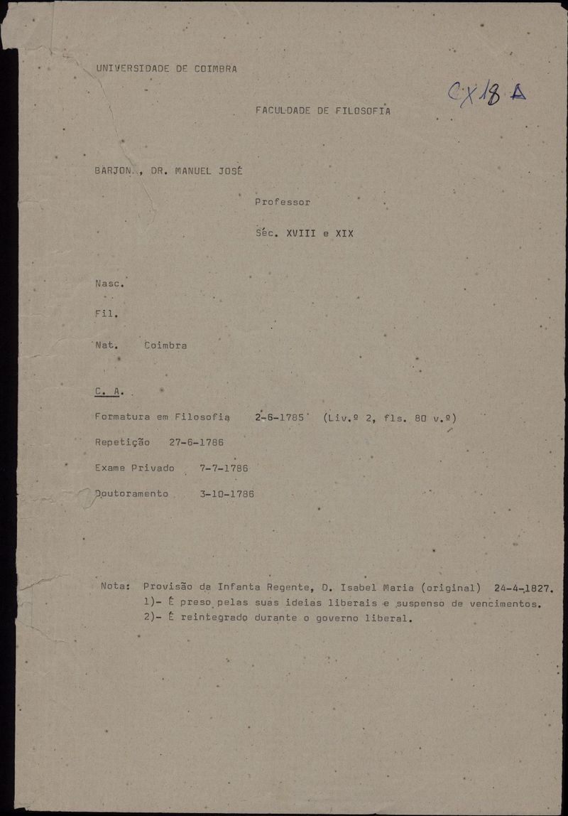 O processo de professor contém documentos ms. referentes à actividade docente exercida por Manuel José Barjona na Faculdade de Medicina da Universidade de Coimbra.
