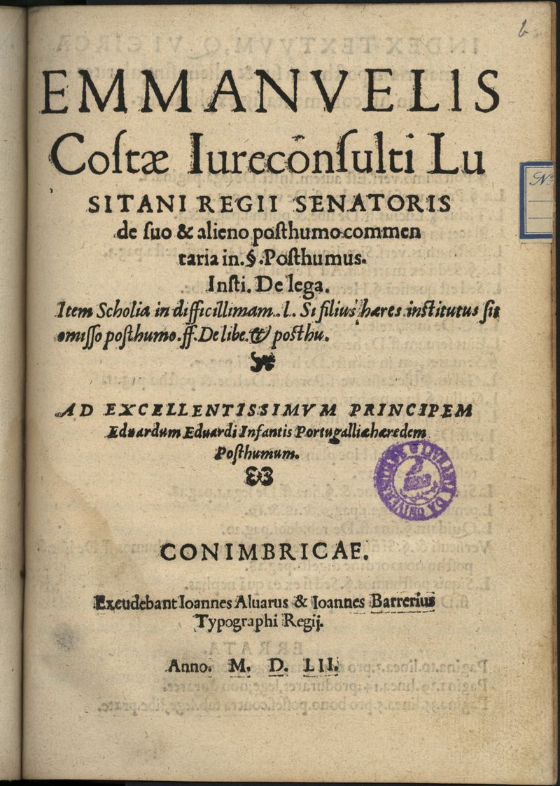 Emmanuelis Costae ... Commentaria in posthumus. inst. de lega. Item scholia in difficilliman l. si filius haeres institutus ... ff. de libe & posthu