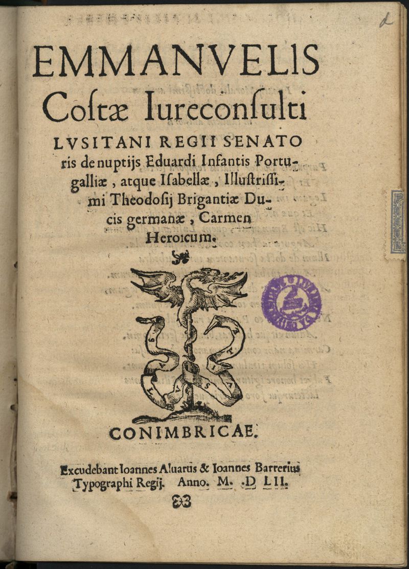 Aparado. - Manchas de acidez e humidade. - Enc. com mais 3 obras do mesmo autor e com "Oratio in laudem Nuptiarum" / Iacobo Teuio Lusitano. - Enc. em pele grav. a ferros secos e lombada grav. a ferros dourados.