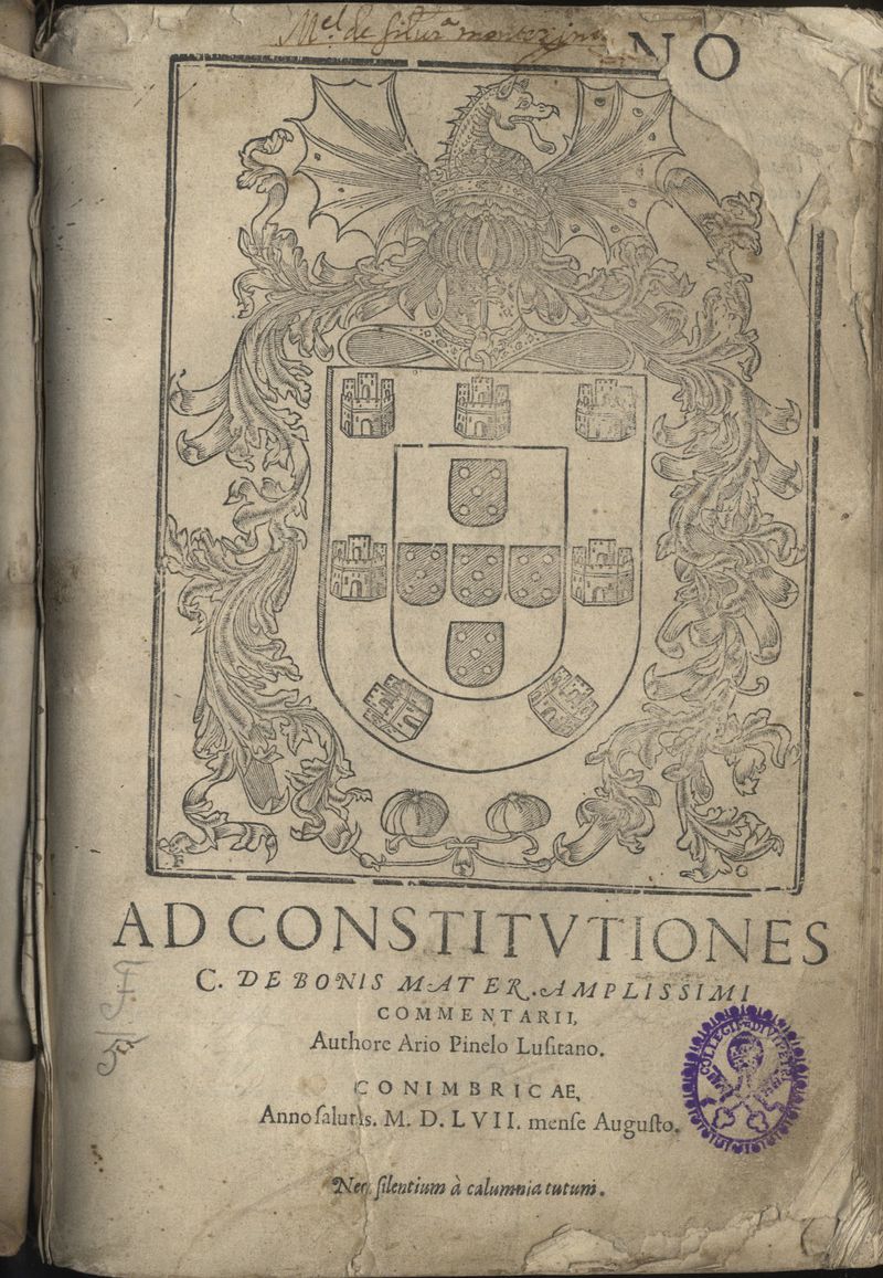 Aparado. - F. de rosto mut. - Manchas de acidez, humidade, manuseamento e picos de insectos ofendendo por vezes o texto; diversas f. roidas. - Notas mss. - Pert. "M.el da Silvr.a Montegino; Real Colegio de S. Pedro; Ex-libris da Faculdade de Letras da Universidade de Coimbra". - Enc. com: "Ad Rub. et L. 2 C. de rescind. vend. commentarii" / authore Ario Pinelo Lusitano. - Enc. em perg. com vestigios de atacas em mau estado de conservacao; enc. solta.