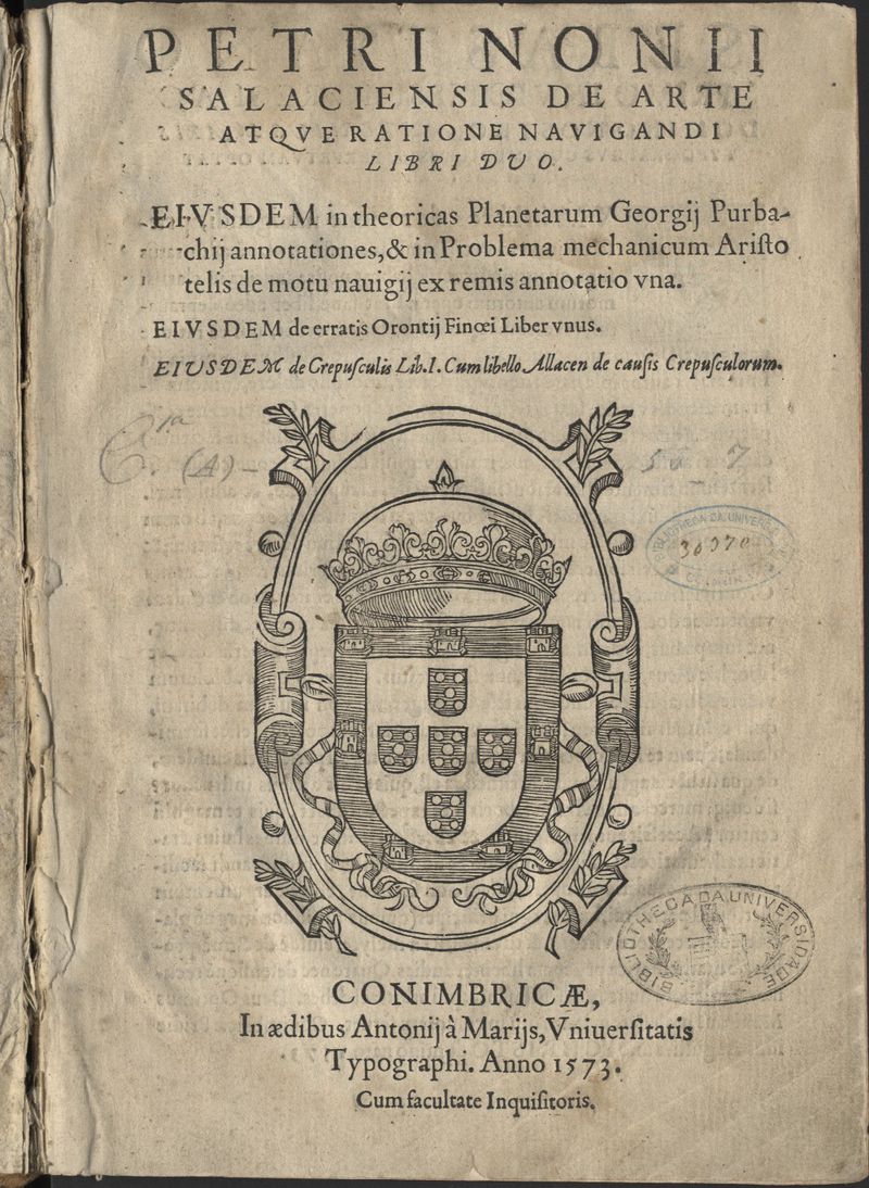Petri Nonii Salaciensis De arte atque ratione navigandi libri duo. Eiusdem In theoricas planetarum Georgij Purbachiij annotationes, & in Problema mechanicum Aristotelis de motu navigii ex remis annotatio una. Eiusdem De erratis Orontij Finoei [sic] liber unus. Eiusdem De crepusculis lib. I cum libello Allacen De causis crepusculorum