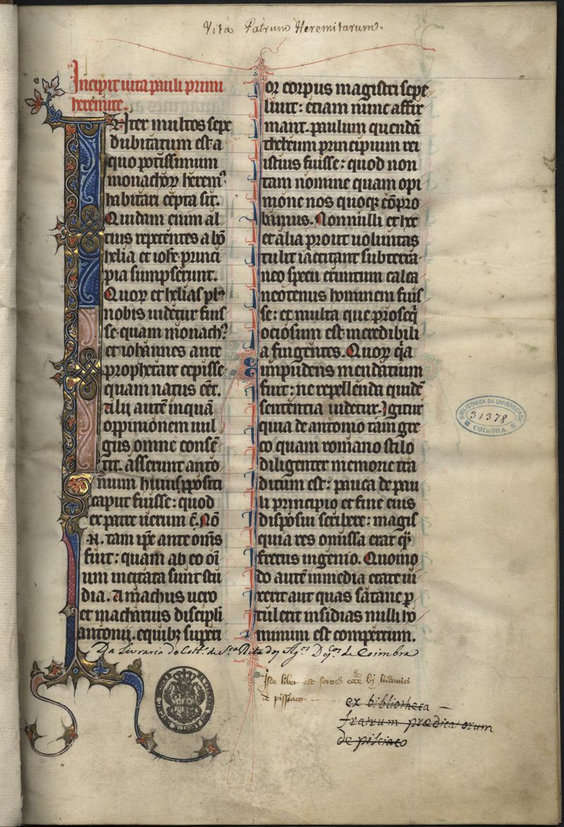 Inic. cap. ilum. ornamentadas a ouro e cores sobre fundos de ouro, azul e rosa velho.