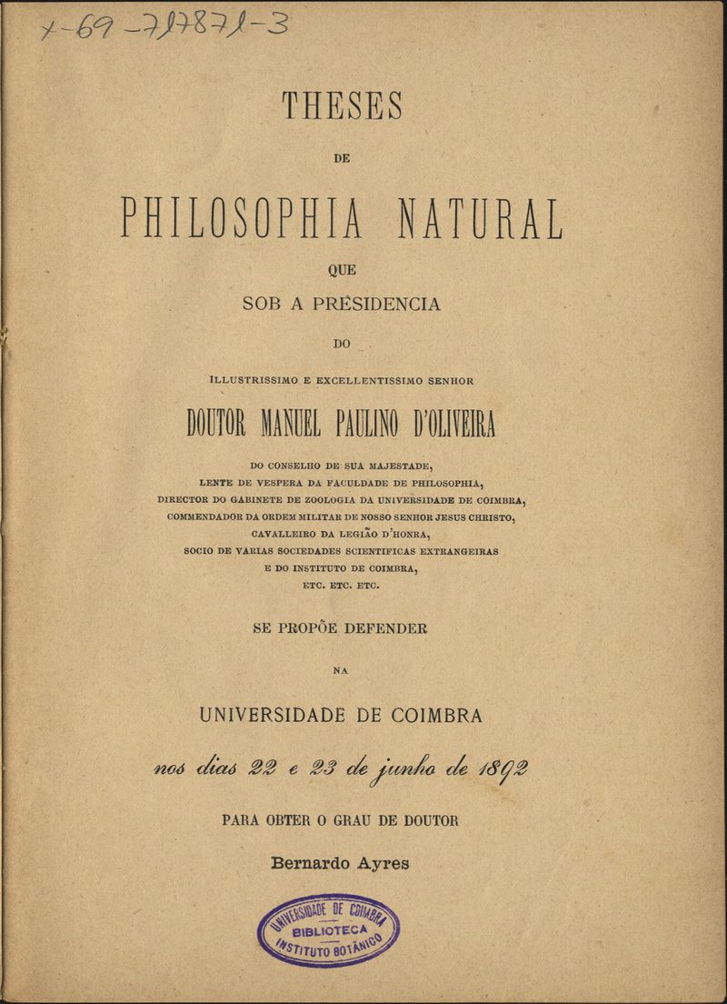 Theses de philosophia natural que sob a presidencia do illustrissimo e excelentissimo senhor Doutor Manuel Paulino d'Oliveira... se propõe defender na Universidade de Coimbra nos dias 22 e 23 de Junho de 1892 para obter o grau de doutor Bernardo Ayres