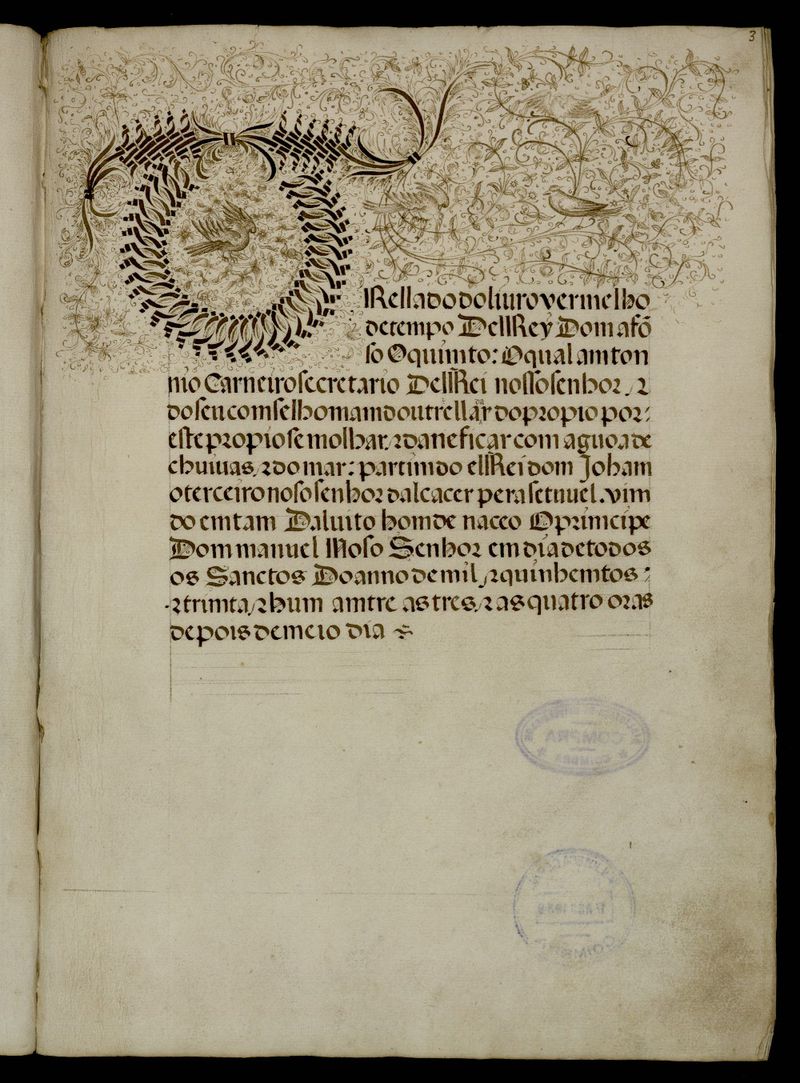 Entre a f. 3 e a f. 21, 7 f. em branco. - F. 76 solta da enc. - As 3 primeiras folhas rasgadas na parte superior. - Manchas de acidez e manuseamento. - Prov.: Colecção de manuscritos de Manuel Severim de Faria. - Enc. da época em pele, quase solta, com um pert. mss. a tinta preta na pasta superior: "Morgado do Vimieiro".
