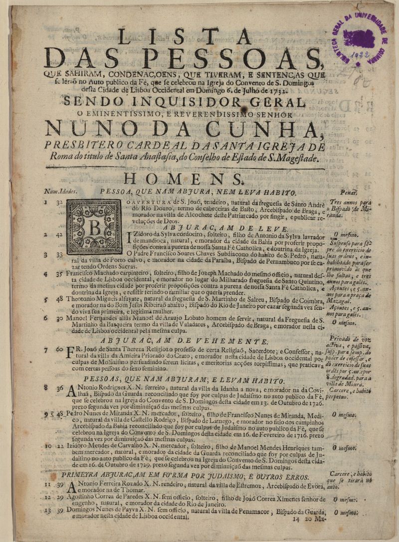Lista das pessoas que sairam, condenações que tiveram e sentenças que se leram, no Auto público da Fé, que se celebrou na Igreja do convento de S. Domingos desta cidade de Lisboa ocidental no domingo, 6 de Julho de 1732 ...