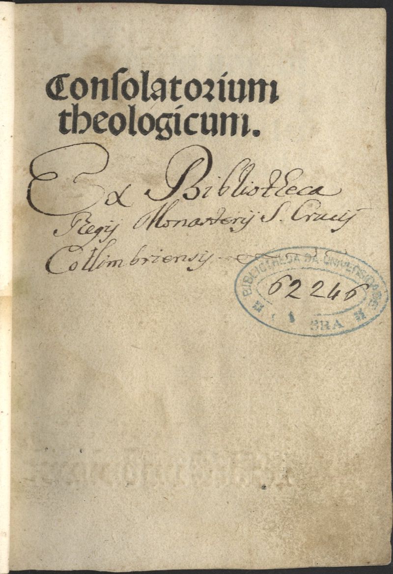 Referenciado em: HC 15237, difere no título: Consolatorium/theologicum; na f. 2//a: Annotatio notabi/liu dicto4 iuxta alphabeticum ordi=/nem in opuscuz sequens; f. 1-(B1): Prefatio /A//25 Incipit pfatio in consolatoriu theologicu predarissimi viri: magistri/Iohanis de Tabaco: Sacrarum littera/rum doctoris