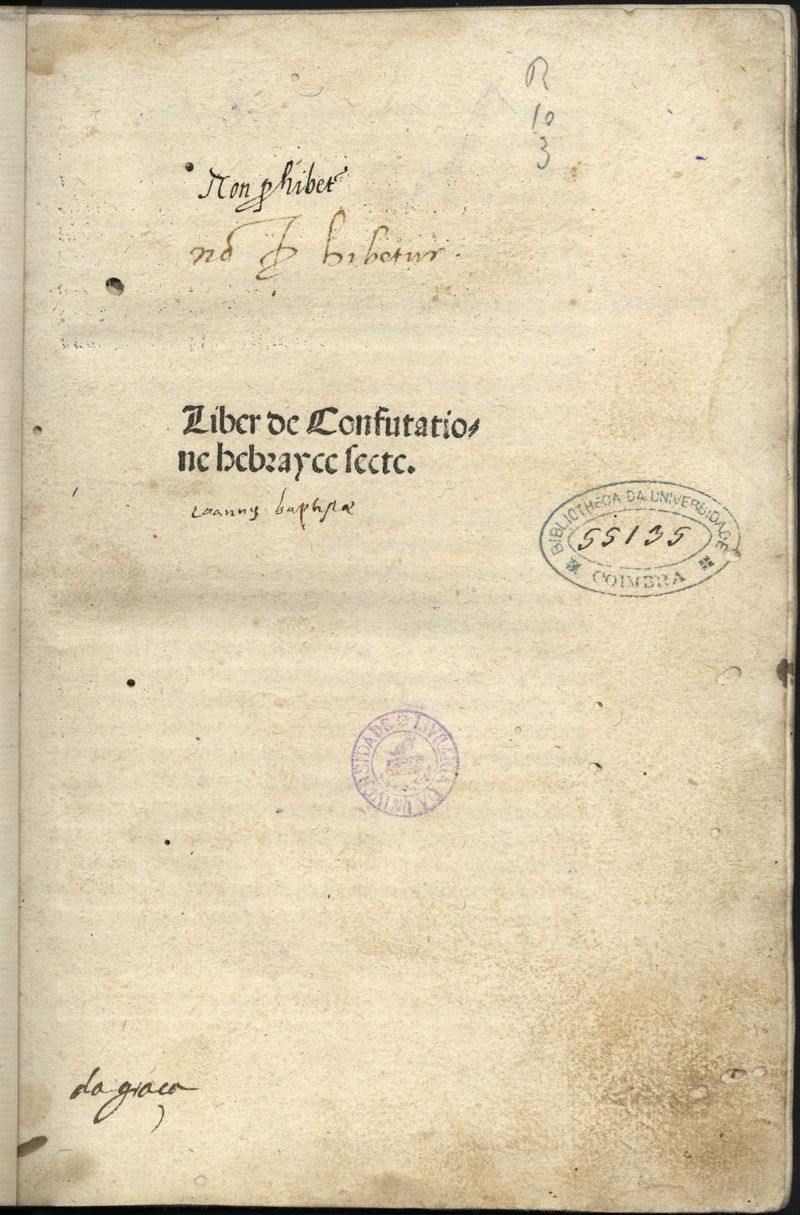 Falta a última f. (em branco). - Aparado, as f. [2, 3, 4] mut. à cabeca ofendendo o texto. - Picos de insectos. - Notas mss. - Pert.: "Da Graca ; Ad usus Magir. Undicti ordis Sti Aug.". - Enc. em pele grav. a ferros secos e lombada grav. a ferros dourados.