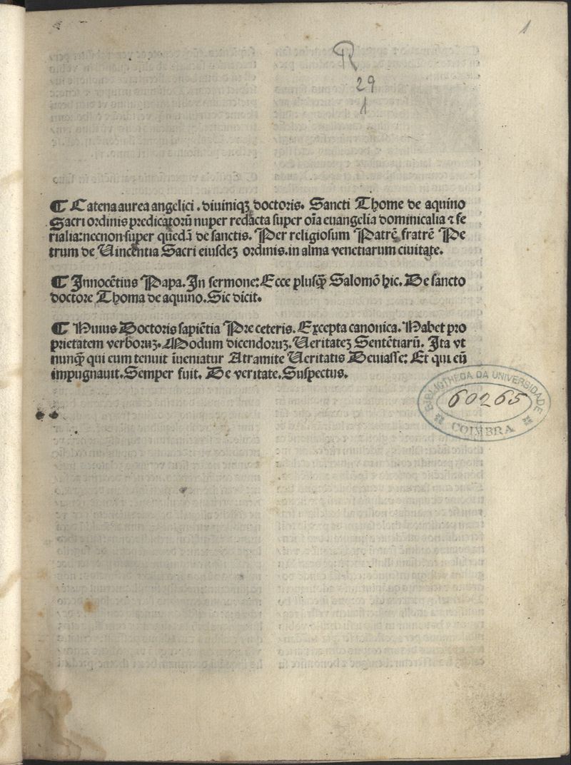 A f. com a assin. y//4 em branco. - Manchas de fungos, humidade e manuseamento. - Enc. com: De Beate Virginis conceptione Ducentorum y sexdecim sancte matris eclesie Doctorum. Vera. tuta: et tenenda sententia. - Enc. em pele grav. a ferros secos.