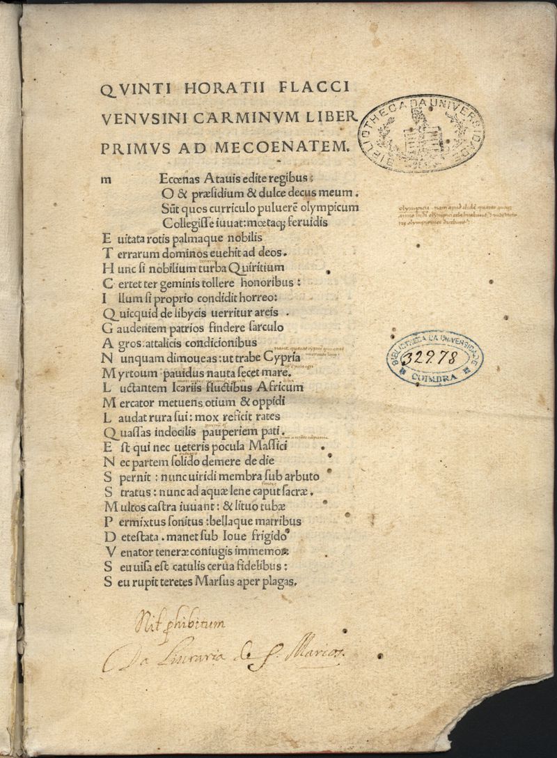 Aparado. - Varias f. mut. no canto inferior direito ofendendo as assin. dos cadernos. - Manchas de fungos, humidade e picos de insectos. - Notas mss. - Pert.: "Do fr. Diogo de Coimbra; Da Livraria de S. Marcos". - Enc. em perg. com vestigios de atacas.