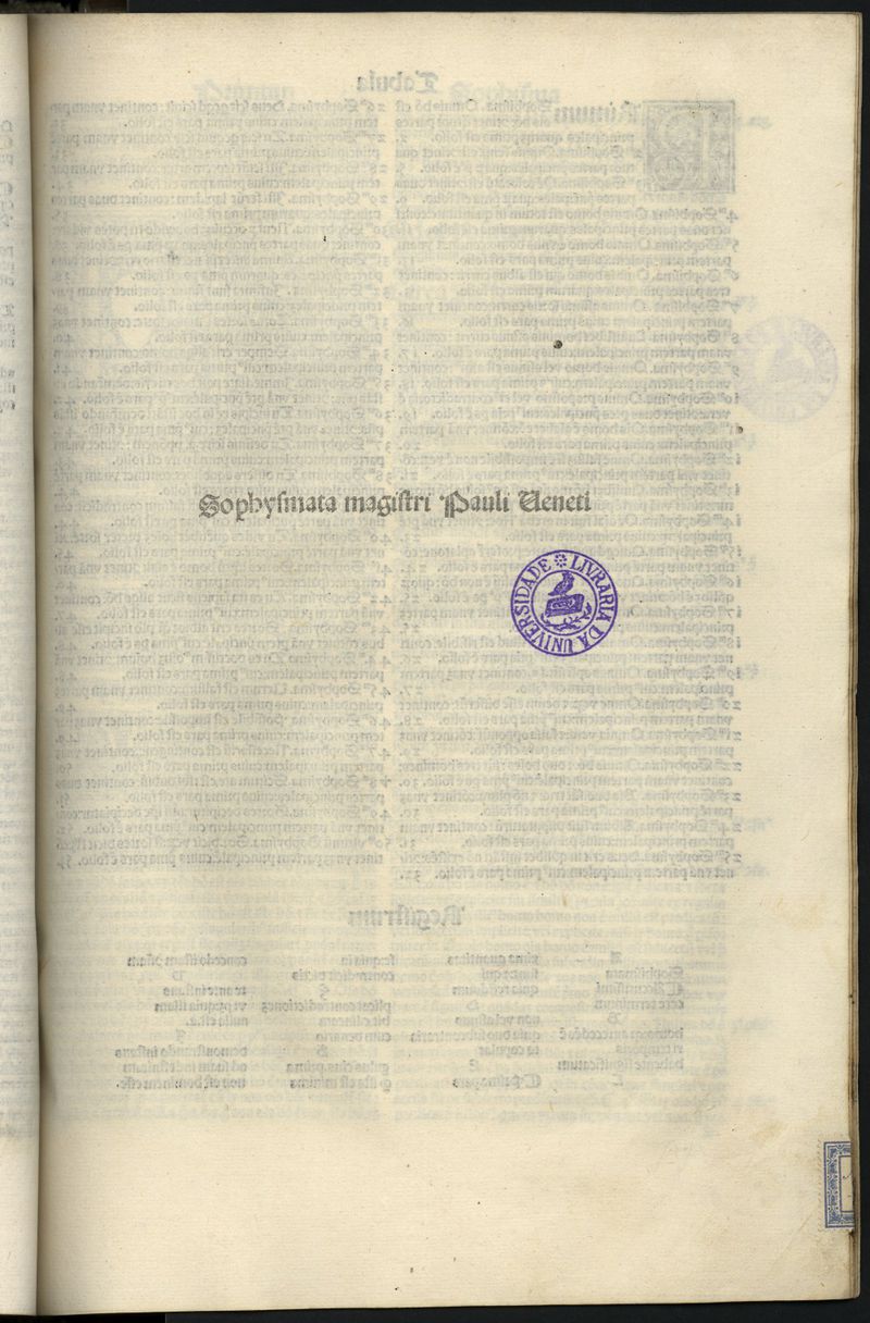 Falta a ultima f. com a assin. J//6. - Manchas de acidez, humidade e de picos de insectos. - Enc. com: Logica Magna; Quadratura Magistri/Paulus Venetus. - Enc. com pastas de madeira revestidas a pele grav. a ferros secos, lombada grav. a ferros dourados, vestigios de fechos de metal.
