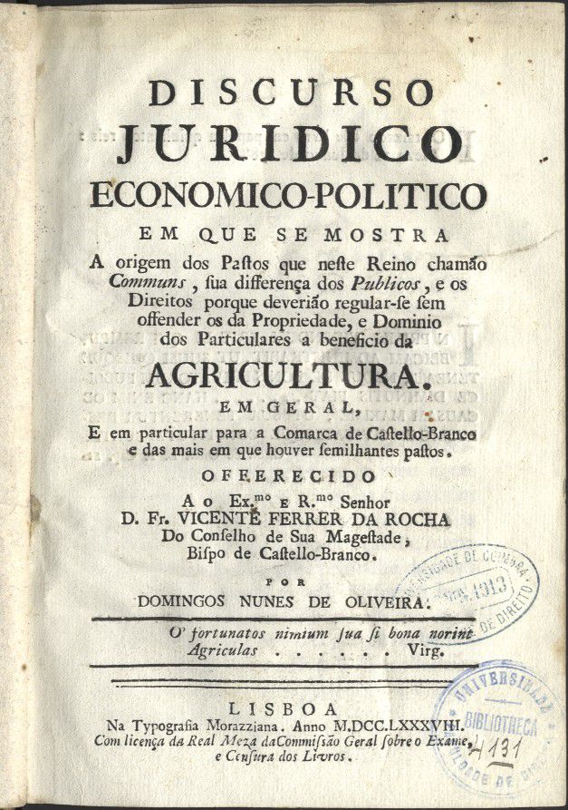 Discurso juridico economico-politico, em que se mostra a origem dos pastos que neste Reino chamão communs, sua differença dos publicos e os direitos porque [sic]deverião refular-se sem offender os da propriedade e dominio dos particulares a beneficio da agricultura em geral e em particular para a comarca de Castello-Branco...
