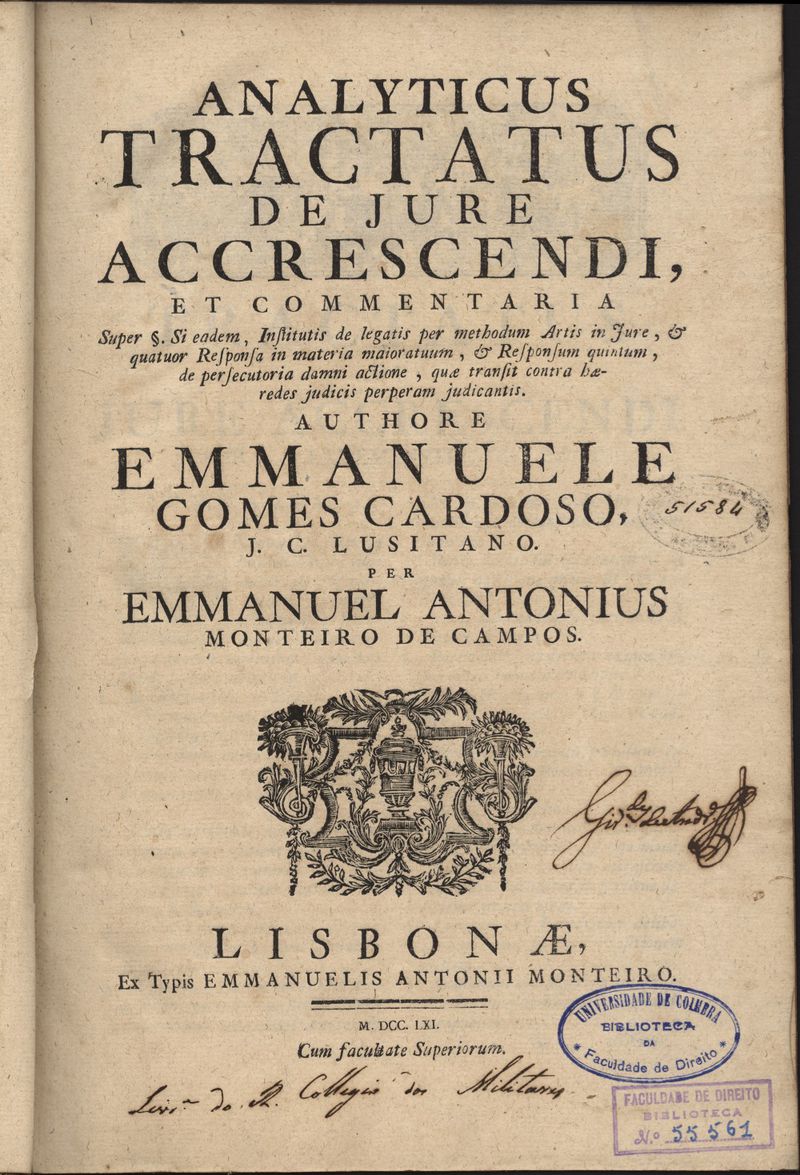 Analyticus tractatus de jure accrescendi, et commentaria super [section symbol] Si eadem, institutis de legatis per methodum artis in jure, & quatuor responsa in materia maioratuum, & responsum quintum de persecutoria damni actione, quae transit contra haeredes judicis perperam judicantis