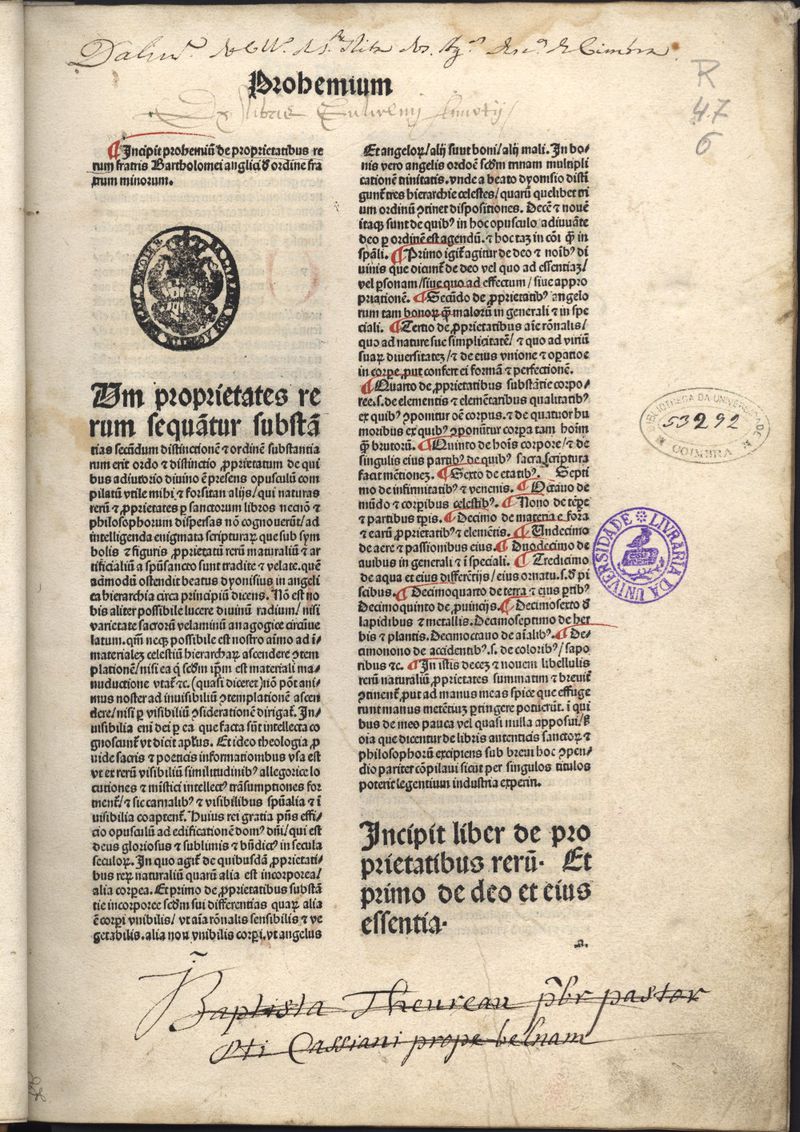 Manchas de acidez e de humidade. - Notas mss. - Pert.: "Da Livraria do Colegio de Santa Rita dos Agostinhos Descalcos de Coimbra; J. Baptista Theureau presbiter pastor Mti Cassiani propre belnam". - Inic. cap. a vermelho e azul e vermelho, caldeiroes a vermelho. - Enc. em pele grav. a ferros secos e lombada grav. a ferros dourados.