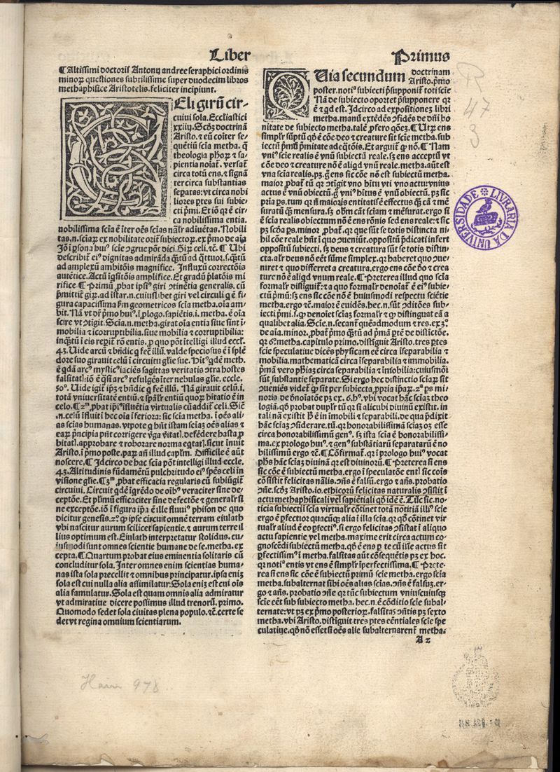 Falta a f. de rosto. - Notas mss. - Enc. com: In Methaphisicae Aristotelis libros commentarii ... / D. Thomae Aquinatis. Questiones methaphisicales / Doctoris Egidii. - Enc. em pele grav. a ferros secos e lombada grav. a ferros dourados.