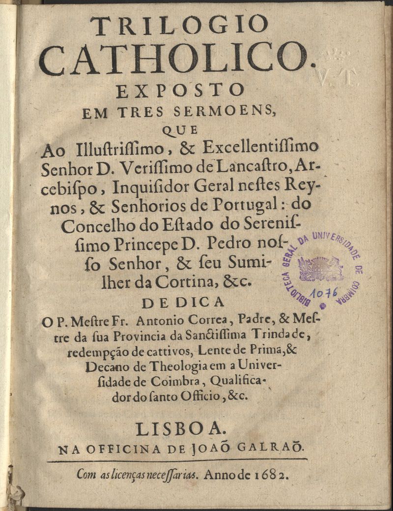 Trilogio católico exposto em três sermões que ao Senhor Dom Verissimo de Lancastre ... dedica o Padre Mestre António Correia ..