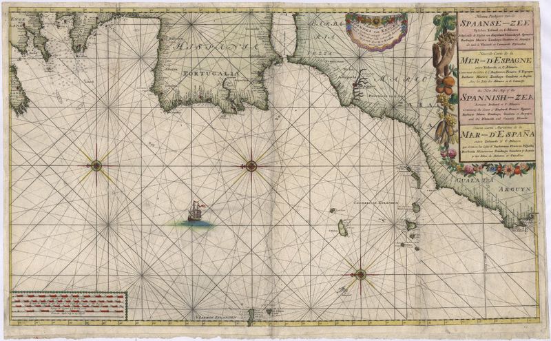Nieuwe Paskaart van de Spaanse-Zee Tusschen Yrland en C:Blanco Behelsende de Kusten van Engelant Vranckrÿk Spanÿen Barbarÿa Maroco Zanhaga Gualata en Arguÿn als mede de Vlaamse en Carnarife Eÿlanden